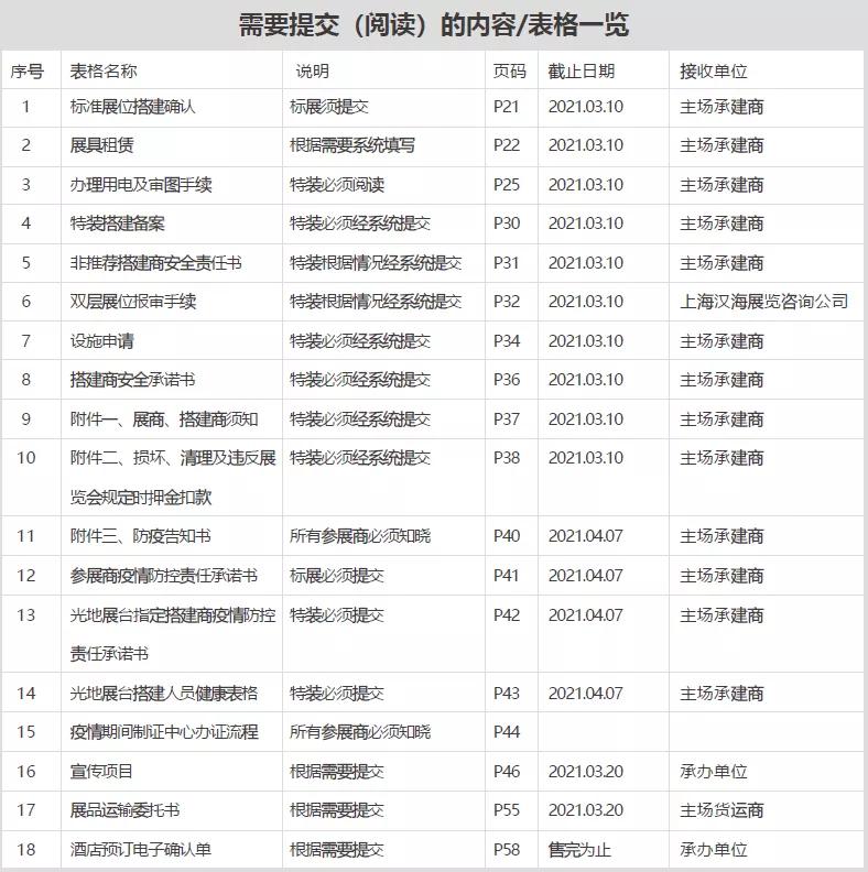 1. 2021年03月10日前,参展商(或特装搭建公司)与主场承建商联系办理审图手续、用电手续和展具租赁手续,经主场承建商审核通过后办理批复通知,如未能通过则需重新设计方案并再次报审。对于最终未能通过审核的施工单位,将不予办理进场施工。报审资料必须注明:展会名称、展会时间、展位号码、参展单位名称、施工单位名称、施工单位联系人、联系电话。